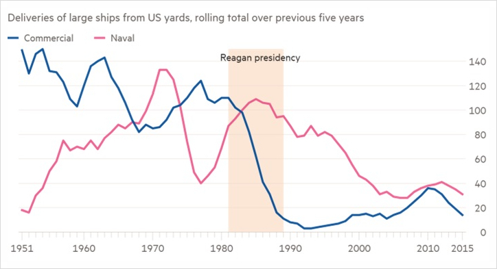 미국 조선업: 로널드 레이건 전 대통령 이후 시작된 쇠퇴