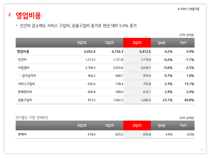 • 영업비용: 6조 4,126억원 (QoQ +4.2%, YoY +5.9%)