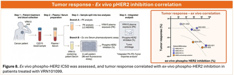 약동학·약물노출(PK)과 약력학·바이오마커(PD)의 종양 반응 간의 관계를 분석한 것으로, 연구진은 환자 혈액에서 VRN10의 농도를 측정한 뒤 해당 혈액 샘플을 HER2 양성 유방암 세포에 처리해 신호전달 억제 정도를 분석했다.
